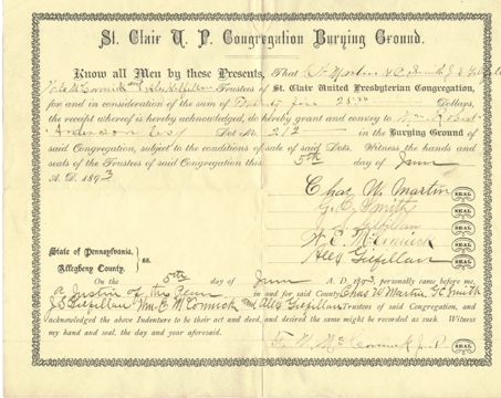 When William died, he left a farm in Moon Township to his son S.A. (Alexander). To his six namesake grandsons he gave and devised “share and share and share and share alike.” His daughter Emma received his fortepiano, daughter Bella received the organ, daughter Annie got the library (including the bookcase), daughter Jennie received the bedding and furniture of “the best bedroom” and daughter Elizabeth received “the remainder of the household stuff.” William also recommended that his farm be sold by his executors. William owned a great deal of land in what is now the Dormont/Beechview area (surrounding what is now Espy Avenue). An 1876 map of the area shows there was once a “Borough of Espey” abutting Union Township. William also owned a sizeable portion of land in what is now Mt. Lebanon where Beadling Road joins Washington Road.